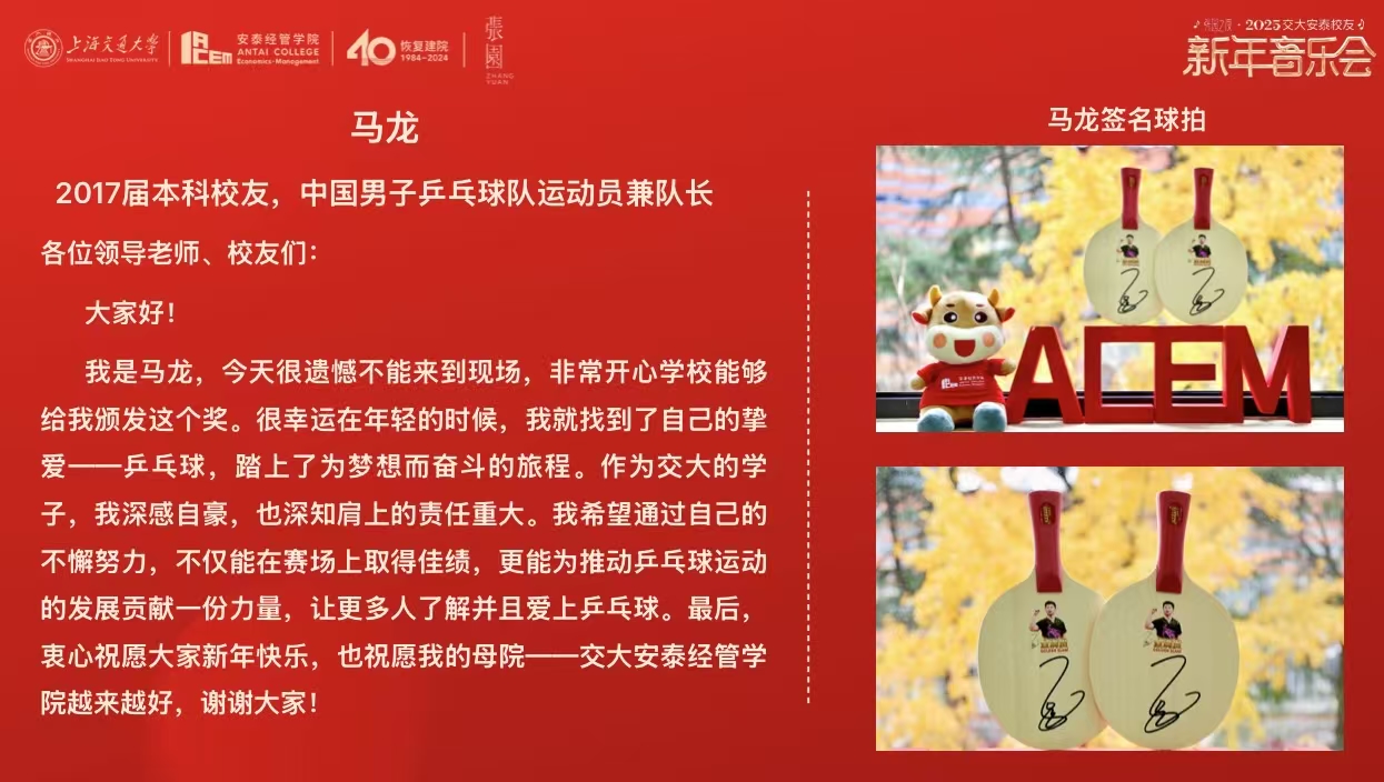 今年是奥运年,本年度个人成就奖获得者、交大安泰2017届本科校友、中国男子乒乓球队运动员马龙发来获奖感言,并向学院赠送签名球拍,祝愿学院越来越好。